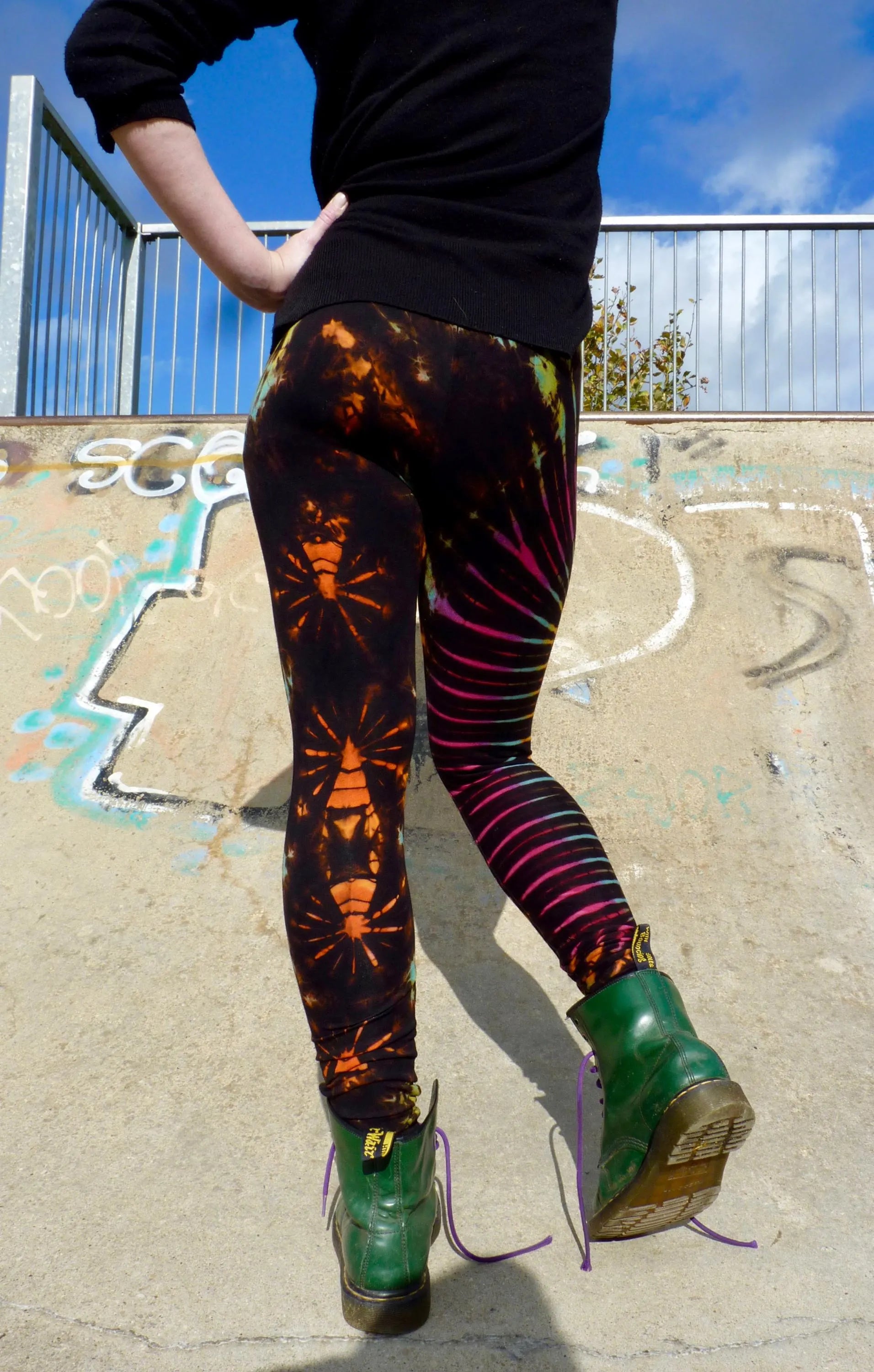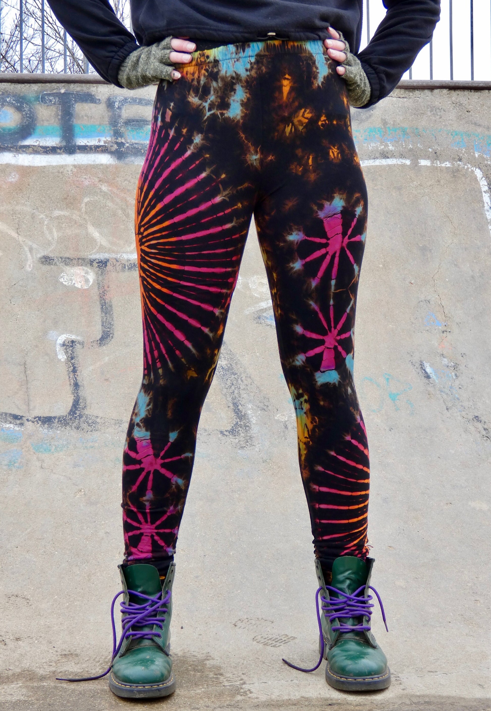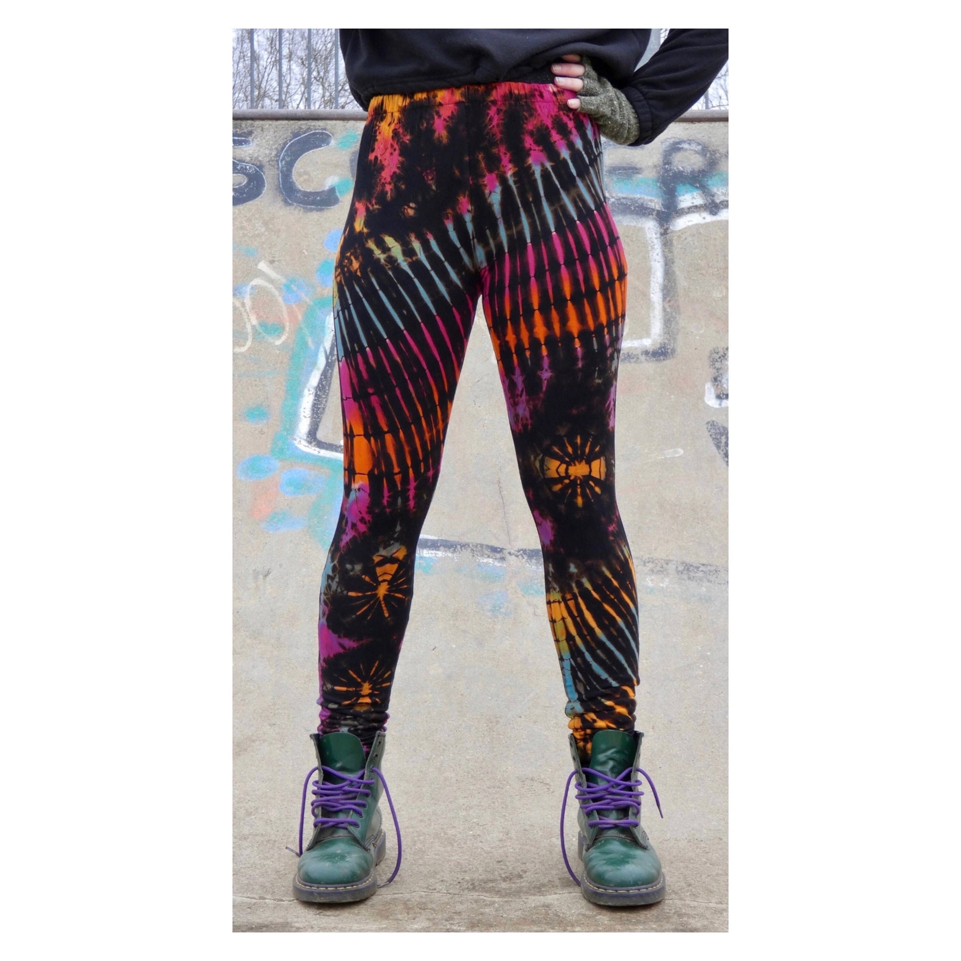 - Hand-dyed rainbow leggings with unique, vibrant patterns, no two pairs are the same