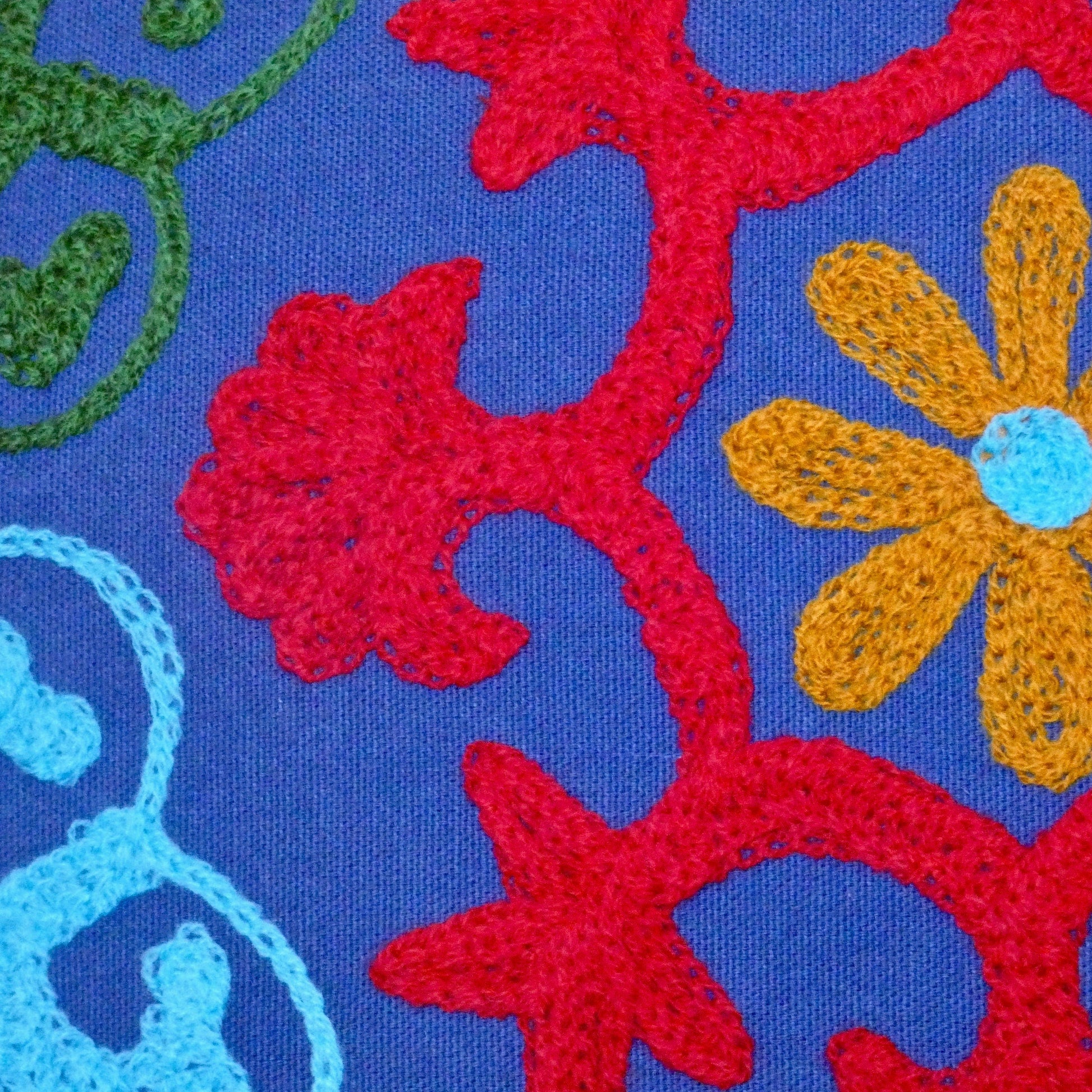 Suzani is a type of embroidered textile originating in Central Asia, particularly Tajikistan, Uzbekistan, and Kazakhstan. For centuries, nomadic women used lush silk threads to create these vibrant patterns on a cotton base. This cushion cover celebrates that tradition with bold stitching, cheerful pom poms, and contemporary craftsmanship.