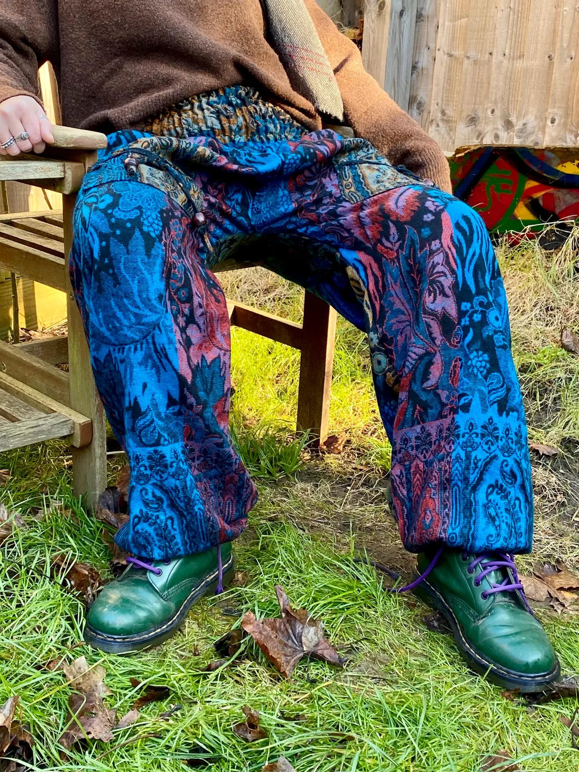 Originally woven as beautiful shawls, each piece has been reimagined into snuggly, unisex boho trousers, giving new life to this soft, tactile fabric. The result is a pair of trousers that feels like wrapping yourself in a blanket — light, breathable, and irresistibly cosy.