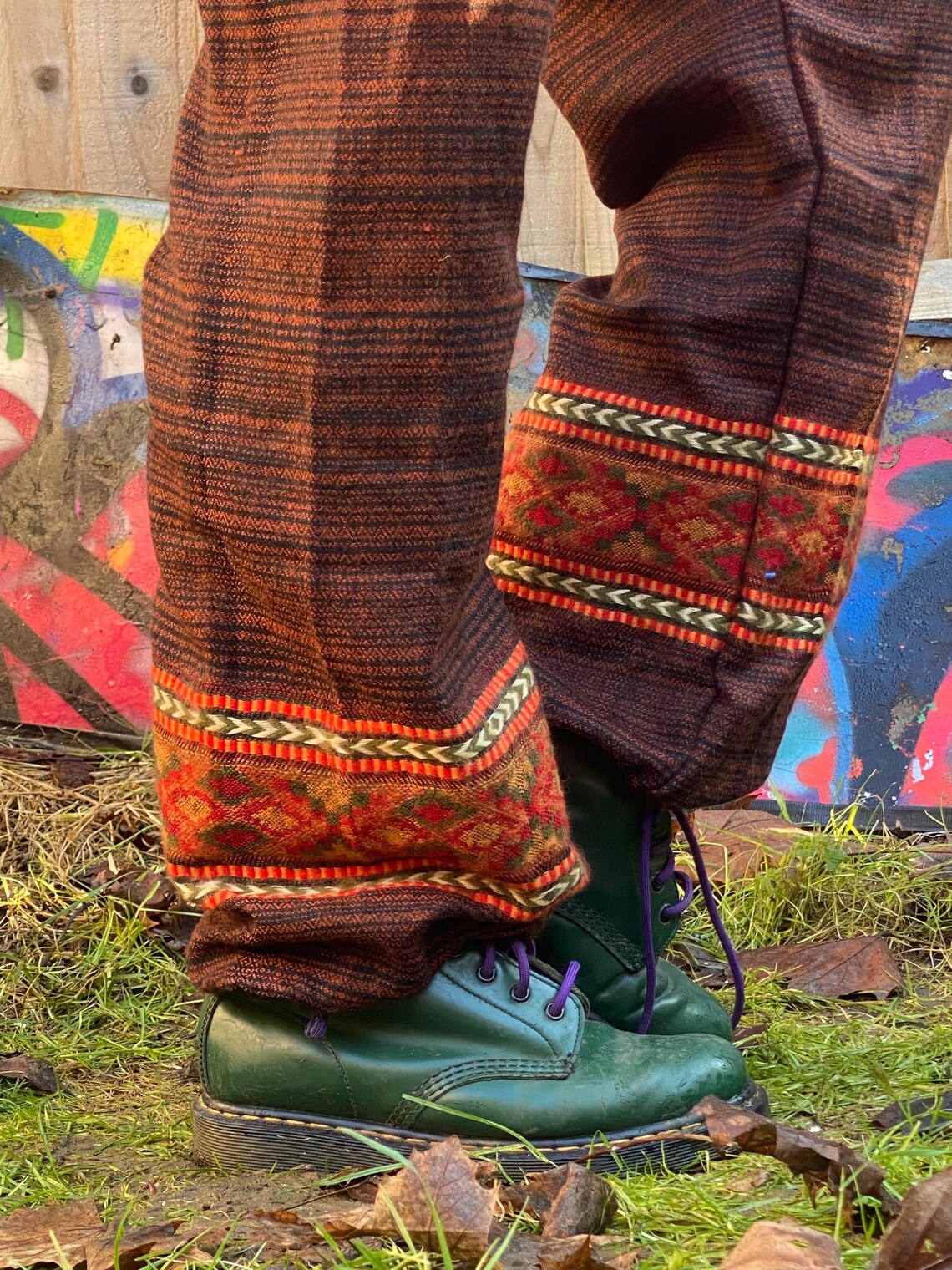 Originally woven as beautiful shawls, each piece has been reimagined into snuggly, unisex boho trousers, giving new life to this soft, tactile fabric. The result is a pair of trousers that feels like wrapping yourself in a blanket — light, breathable, and irresistibly cosy.