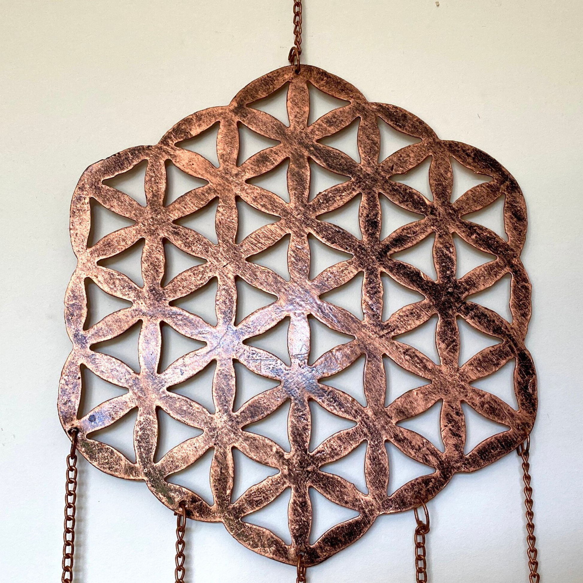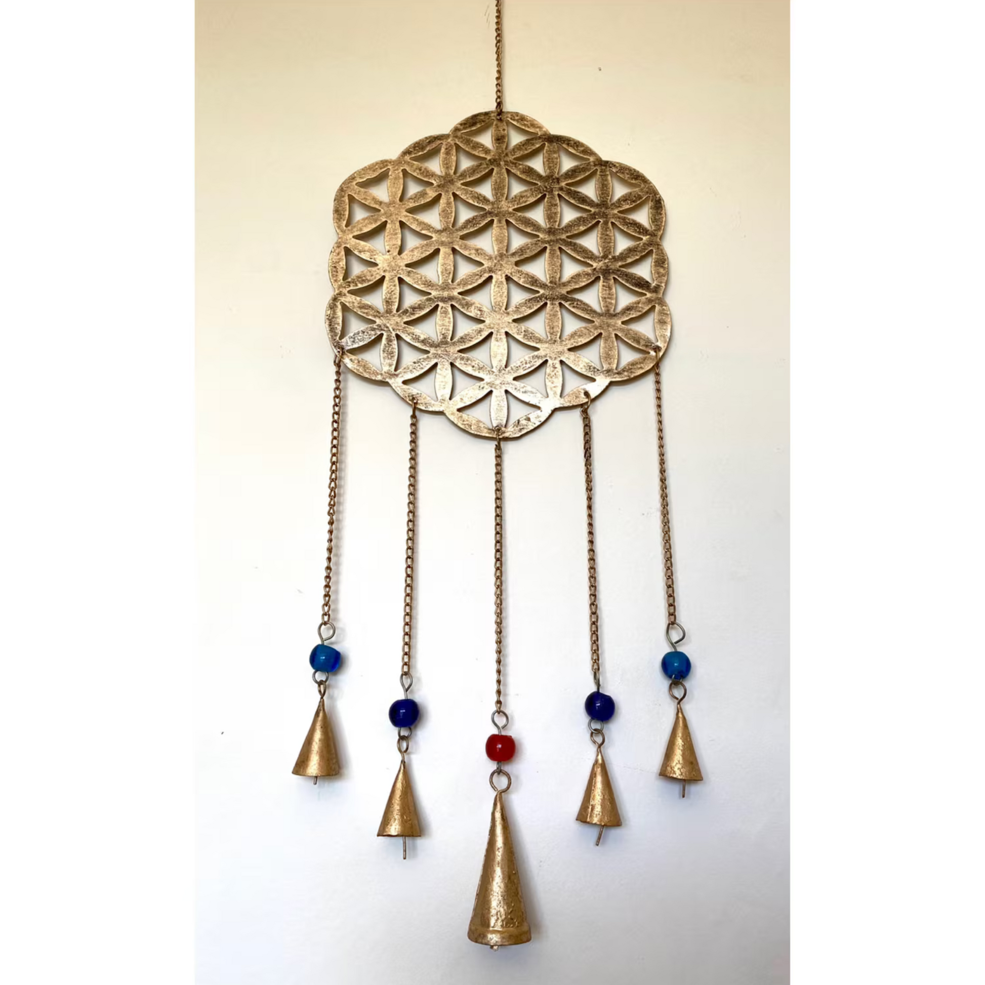 Handcrafted Flower of Life wind chime, a boho brass or copper wall hanging inspired by sacred geometry for indoor or outdoor spaces.