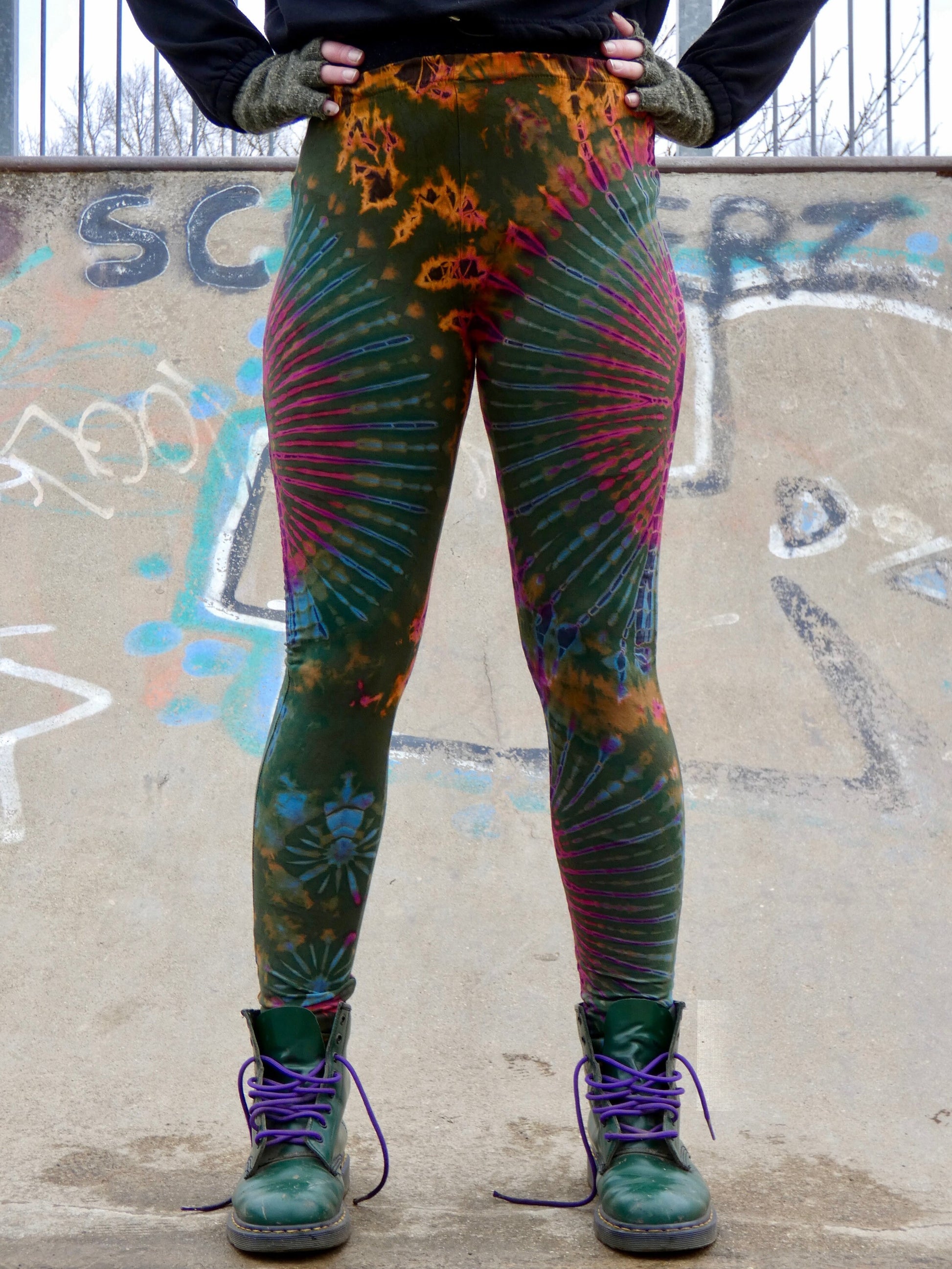 - Hand-dyed rainbow leggings with unique, vibrant patterns, no two pairs are the same