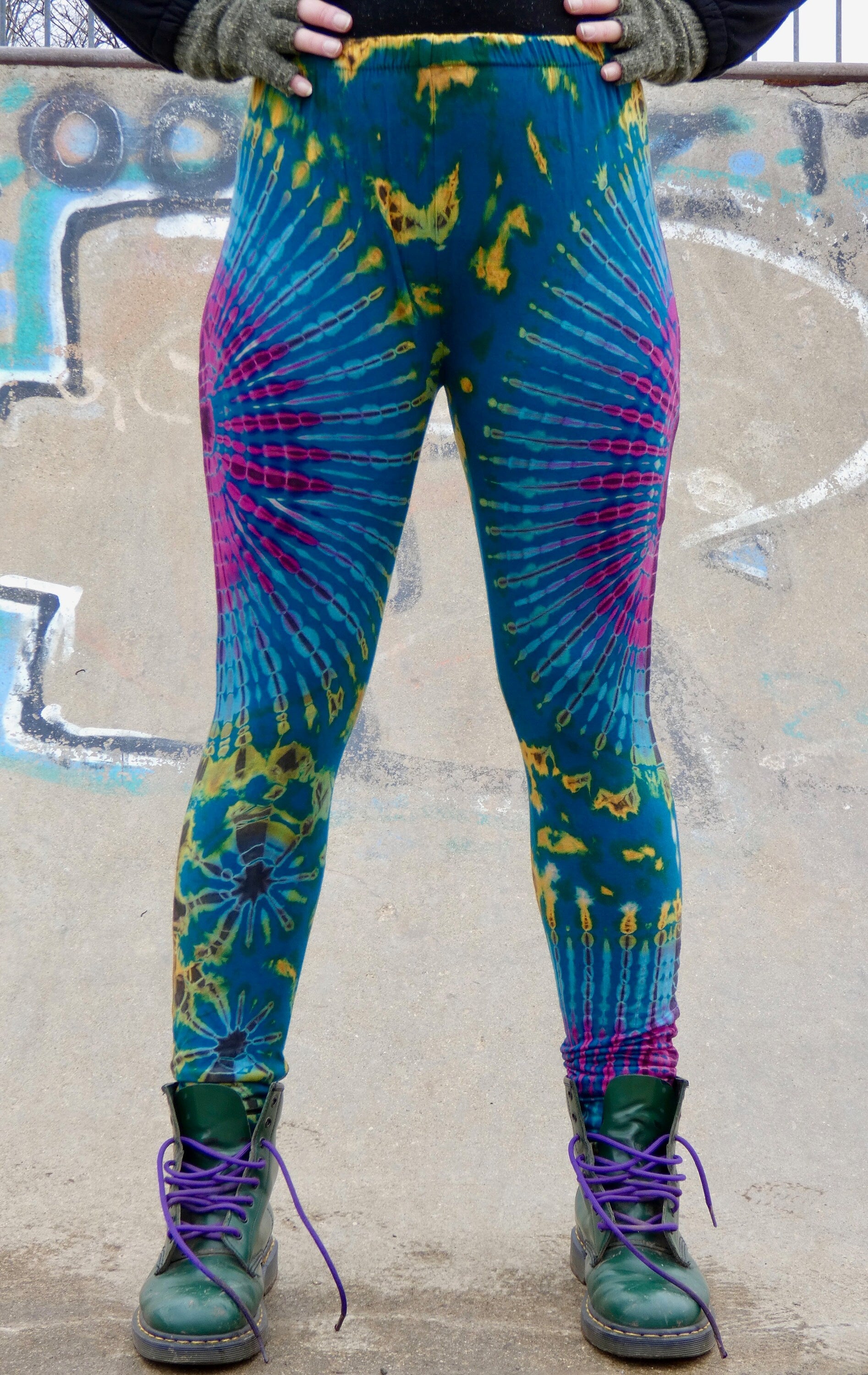 - Hand-dyed rainbow leggings with unique, vibrant patterns, no two pairs are the same